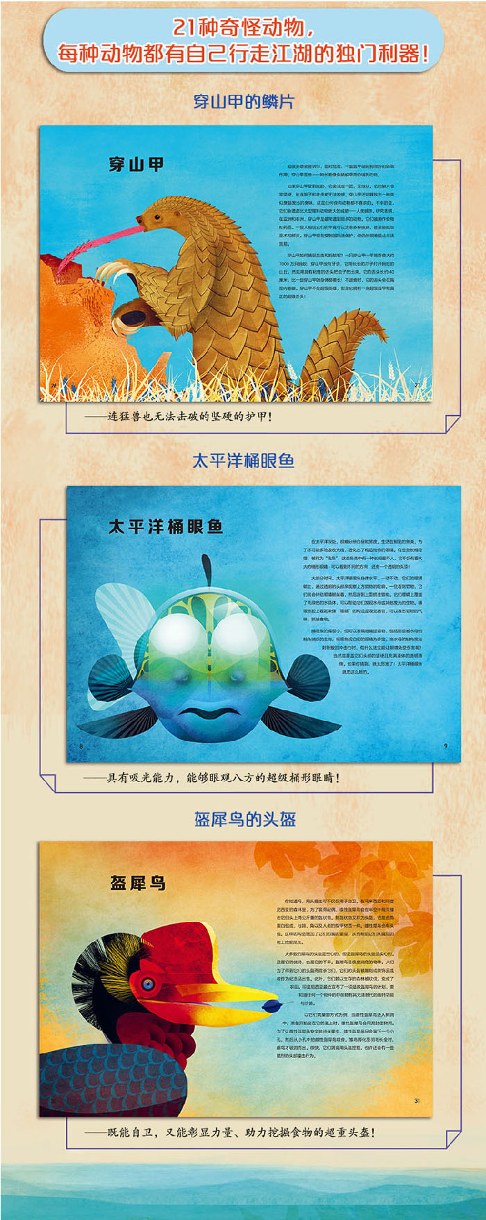 入选美国2018-2019年度孩子*喜爱的非科幻类榜单 每一种动物都有自己行走江湖的独门利器 上天入地,下海爬山,奇怪动物的冷知识,唤醒孩子强烈的兴趣 清晰精美的跨页插图,带来美好的视觉体验 跟孩子一起玩“猜猜这是什么动物”的游戏
