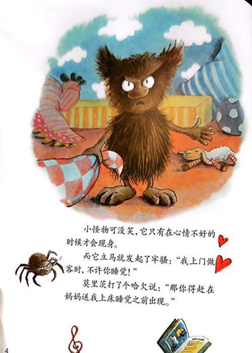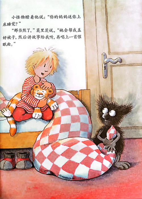 《困了吗,小怪物》讲了主人公莫里茨和小怪物之间晚上睡觉的故事,小怪物具有小孩子的性格,晚上不好好睡觉,睡觉之前有很多附加条件,其实小怪物脑子里还有很多“坏点子”,捉弄莫里茨,心情变坏时,他就出现了!心情变好时,小怪物就渐渐地消失了。心情时好时坏,符合小孩子的性格,就像身边的孩子一样。