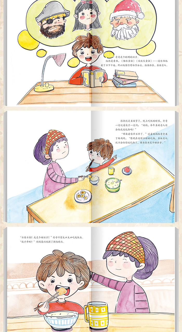 圣诞节前夜,很多孩子都会将袜子放在床头,以便圣诞老人能给自己送礼物。但是这些袜子里的礼物都是爸爸妈妈放进去的。爸爸妈妈对孩子的爱是无私的。奇奇的爸爸在圣诞节前夜装成一个猫老人把奇奇喜欢的礼物放进床前的袜子里,后来被奇奇发现了,跑的时候还从屋檐上摔到地上了。为了维护圣诞老人在奇奇心中的地位这些他都不敢和奇奇说。。这是一本原创儿童绘本,图文并茂,有教育意义。书中所选的小朋友的坏习惯和遇到的事例都是孩子们在成长中会遇到的,非常贴近生活。家长们可以为孩子阅读故事,让孩子们融入其中,感同身受,从而达到学习成长的效果。是成长期小朋友阅读的良选。故事简介情节完整,有极强的代入性,潜移默化,帮助孩子健康成长。