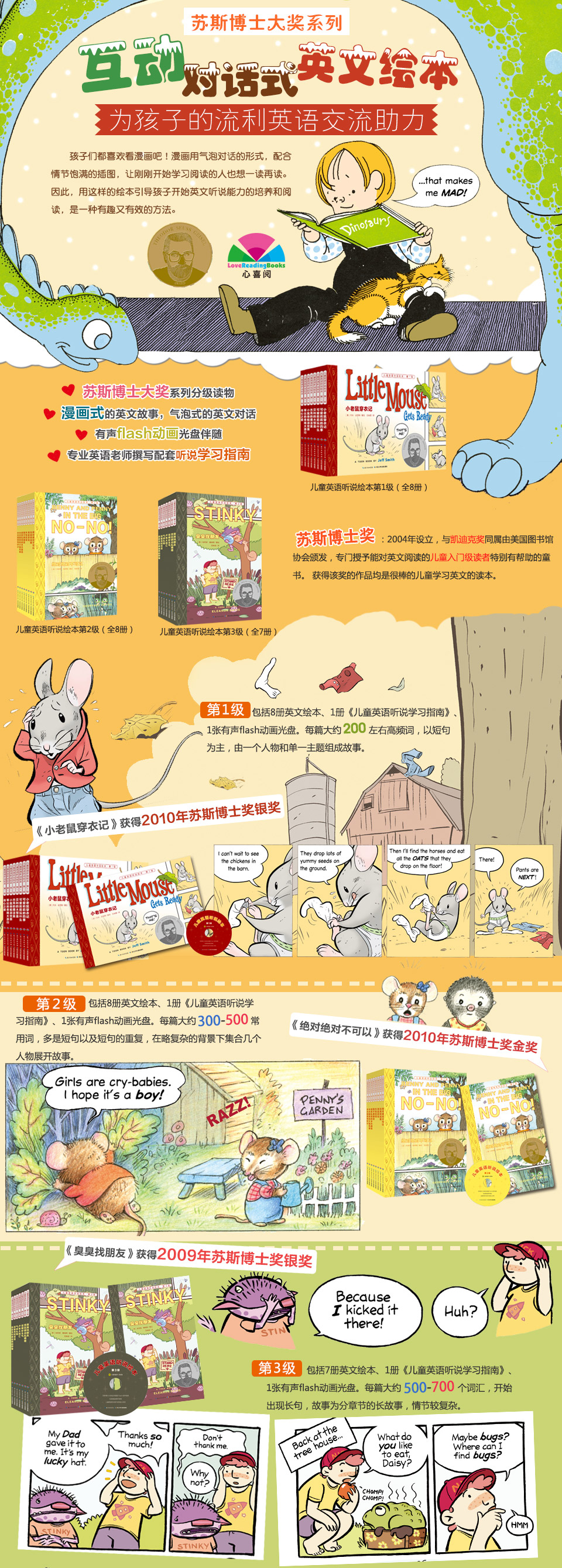 这套《儿童英语听说绘本》按照词汇、句式和故事的难度,共分为3级,本系列是其中的第3级,内含7册全英文绘本故事、1册英语听说学习指南和1张flash有声光盘。7册绘本故事中的《臭臭找朋友》获得苏斯博士银奖,整个套系被评为纽约时报畅销书等数十个荣誉奖项。