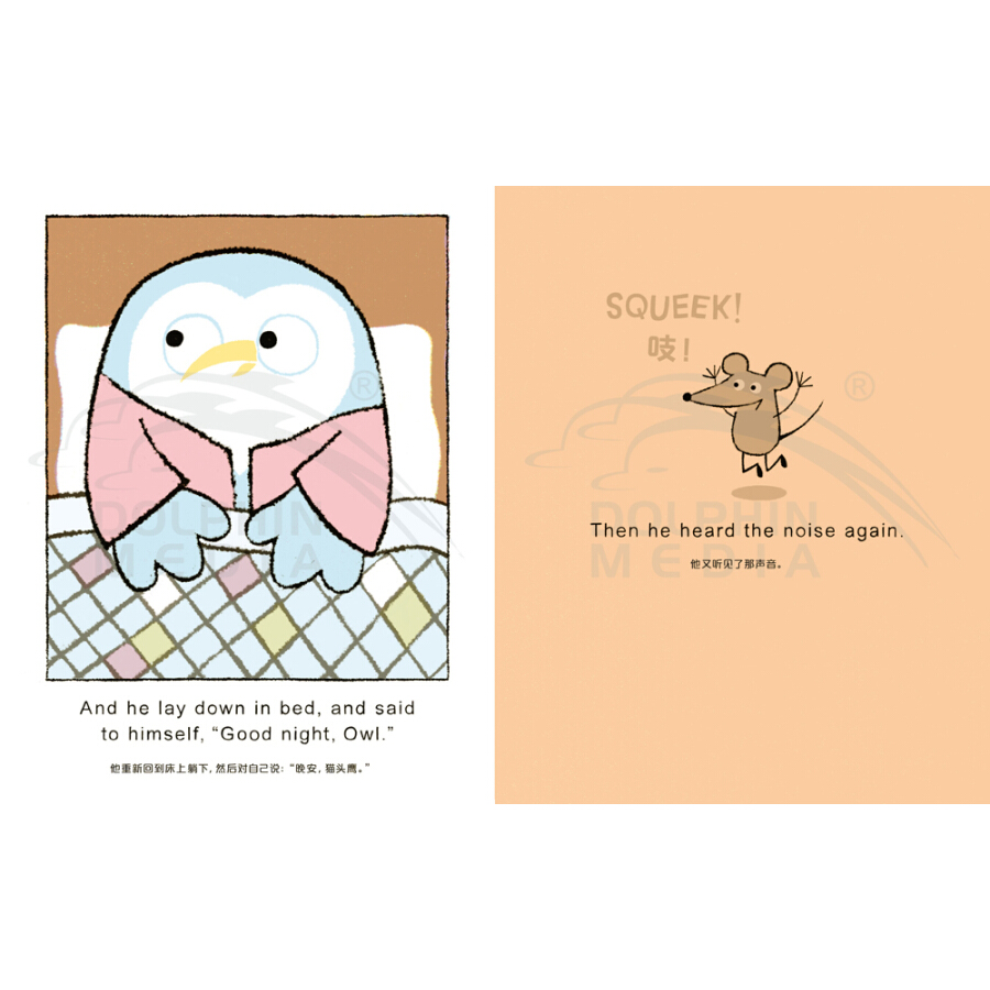 猫头鹰准备睡觉了,他对自己说:“晚安,猫头鹰(good night,owl)!”但每次他刚刚闭上眼睛,就听到房间里奇怪的叫声:squeek!猫头鹰睁开眼睛,在房间里找那个声音的来源。猫头鹰把橱柜、书架、地板统统都翻了个遍,他能找出那个奇怪的声音,然后安心睡觉吗?……猫头鹰将永远不会睡觉,除非他能搞清楚这是怎么回事!也许,一句温柔的由此及彼的“晚安”是让大家都能享受安稳夜晚的魔法……