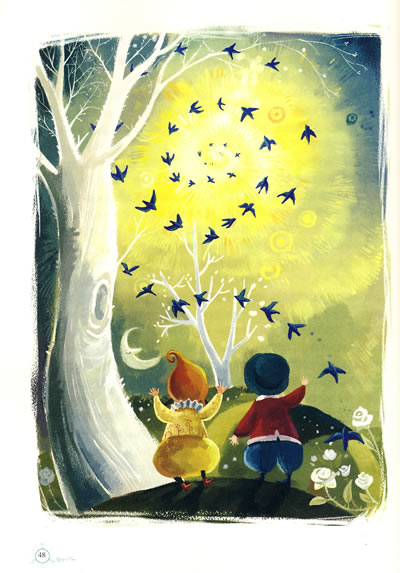 爸爸棣尔的小屋,是村子里最破旧的一所。小屋里陈设简陋,墙角的壁炉里生着火。厨房里摆放着各种器皿,大而包箱放在一旁。屋子里有一个大衣柜,衣柜角蜷伏着一只狗和一只猫,它们在酣睡着。苗和狗的中间放着一大块蓝白两色的大方糖。墙角有一座落地大钟,墙上还挂着一个圆形鸟笼,里面关着一只斑鸠。桌上点着一盏灯。小屋的右边是两张孩子睡的小床,床头放着两把椅子,搁着折叠整齐的衣服。小屋的对面有一幢豪华的别墅。白天,别墅里的富家孩子们在暖房、花园、平台上快乐地做着游戏;晚上,别墅里灯火通明,像一个燃烧着火的灯笼一样,照亮伐木人的小屋。