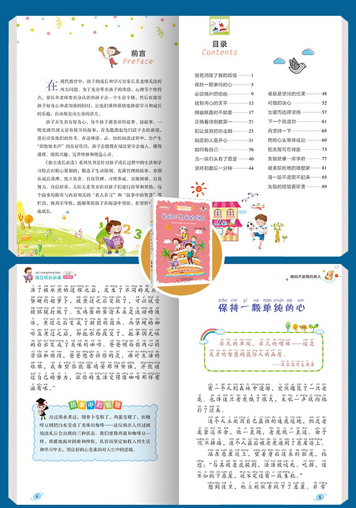 《爸妈不是我的佣人》—让孩子懂得爸妈一片苦心每个父母都爱孩子,都希望孩子变得优秀。但是,爱不是简单的给予,而是让孩子懂得父母的付出,懂得从他一出生到慢慢长大,都要慢慢学会走自己的路,都要自立自强。《爸妈不是我的佣人》这本传递正能量的书,通过一篇篇通俗易懂的美文,让小读者在阅读中学会爱,学会自立,学会自强。成为让爸爸妈妈放心的孩子,能够大声对爸爸妈妈喊出心里话:我长大了!