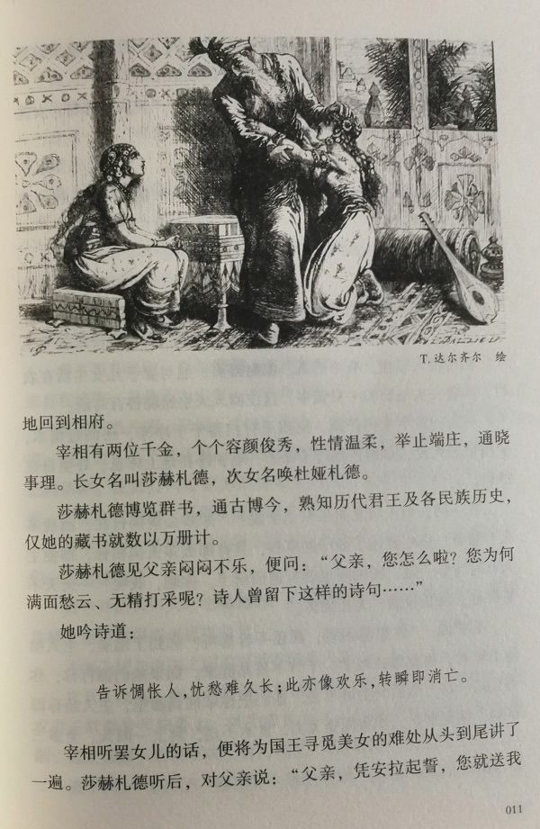 相传,印度与中国之间有一个萨桑国,国王因王后行为不端,将王后杀死。这以后,国王每日娶一女子为妻,第二天杀死。宰相的女儿莎赫扎德自愿入宫嫁给国王,一方面利用讲故事的方式吸引国王的注意,躲避被杀死的命运,另一方面用故事来感化国王。最终,莎赫扎德将国王感动,成为萨桑国王后,与国王白头偕老。