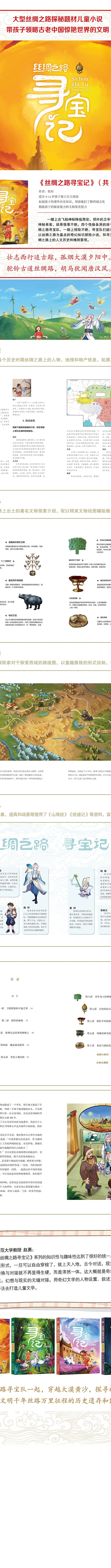 《丝绸之路寻宝记》系列图书,用小说形式带领少儿读者穿过那些辉煌无比的历史帷幕,领略古老中国光芒四射的文化和历史。重点讲述丝绸之路上曾发生过的重要历史事件,本系列图书以文字为主,主题紧紧围绕丝绸之路展开,设定外星人卡西来到地球寻找祖先曾经留在地球上的十根能量柱,得到地球少年卫小安和刘浩的帮助。由于完成任务的线索赋予了历史价值,因此他们所寻的能量柱将更深刻更有意义,力求每一根能量柱都有其特有的历史意义和文化意义,以打动读者,在读者心中打下深刻烙印。通过阅读故事,提升他们的历史、地理、人文等相关知识。第一册主人公为张骞,历史背景围绕张骞出使西域的经历展开。