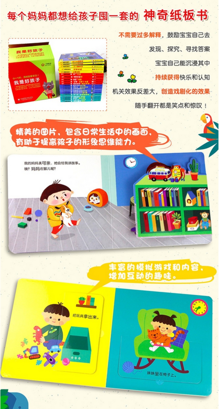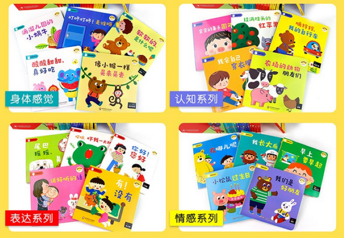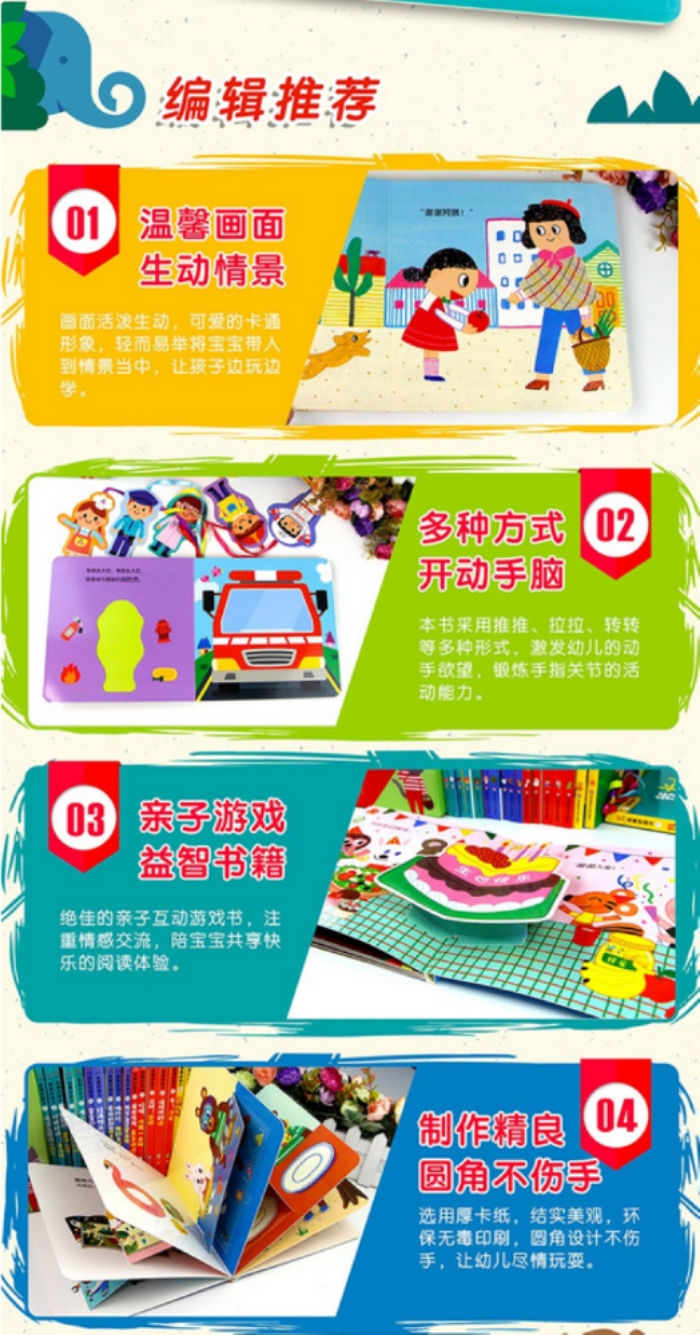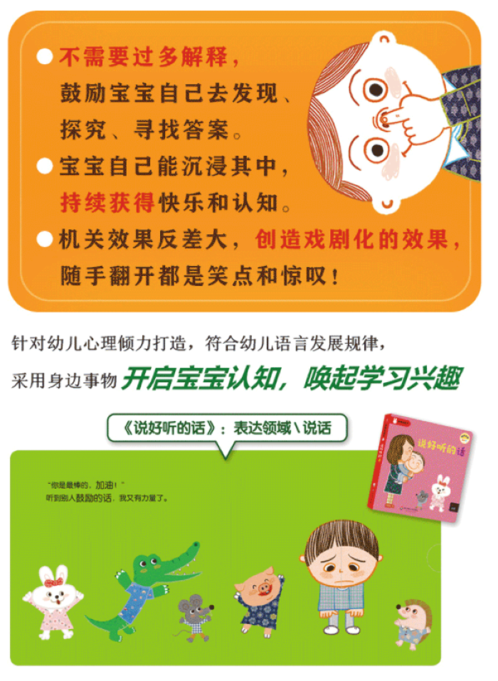 本书设置了身体·感觉、认知、表达、情感四大儿童发展领域,通过翻一翻、拉一拉、贴一贴、转一转、推一推等新颖、巧妙、完备的互动游戏,使0-3岁的幼儿在游戏中发展感知觉能力,丰富情感表达,认识身边的世界。图书制作精良,采用撕不烂纸板、圆角工艺、环保印刷。