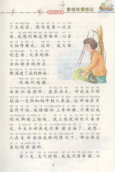 本书讲的是英国青年鲁滨逊从小喜欢航海,曾三次离家到南美各地旅行。一日他怀着云游四海的高远志向,告别家人,越过大西洋和太平洋,在惊心动魄的航海中经历无数险情,后来整条船在太平洋上不幸罹难,船上的人都葬身海底,惟有他一人得以奇迹般地活下来,并只身来到一座荒无人烟岛上。 他从绝望的缝隙中得到了生命的启示,性格坚强的鲁滨逊在岛上独立生活了28年。他在孤岛上劳作生息,开拓荒地,圈养牲畜,生产水稻和小麦,年复一年与孤独为伴,克服了种种常人难以克服的困难。《圣经》成为他的精神支柱,凭着惊人的毅力和顽强不息的劳动,他盖起了房子,收获谷物,驯养山羊,用兽皮制作衣物。他曾与野兽斗智,也曾与吃人肉的野人斗勇。后来他搭救了一个土人,称他为“星期五”,把他收作仆人。他以非同寻常的毅力和勇气,克服了难以想象的艰难困苦,用勤劳的双手,为自己创造了一个生存的家园。