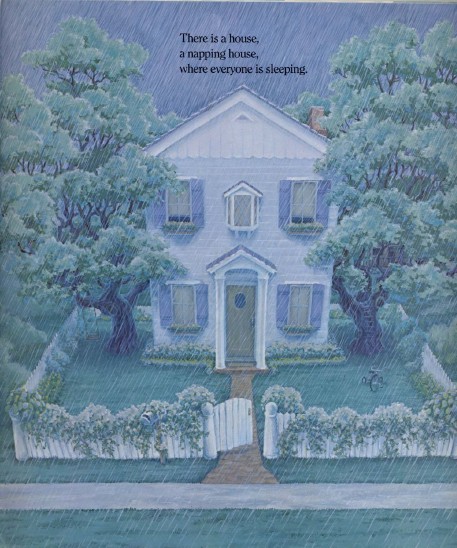 《打瞌睡的房子》,一本非常美的图画书。迷濛的蓝、密密的雨打在开满栅栏的蔷薇花上,“有一栋房子,打瞌睡的房子”在雨中沉沉地睡着。