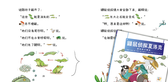 第五个案件,和青蛙有关系。夏天到了,鸭妈妈照顾的小蝌蚪消失了,她求助鼹鼠侦探找一下小蝌蚪,最后鼹鼠侦探找到了已经变成青蛙的小蝌蚪,那小蝌蚪是怎么消失的呢?