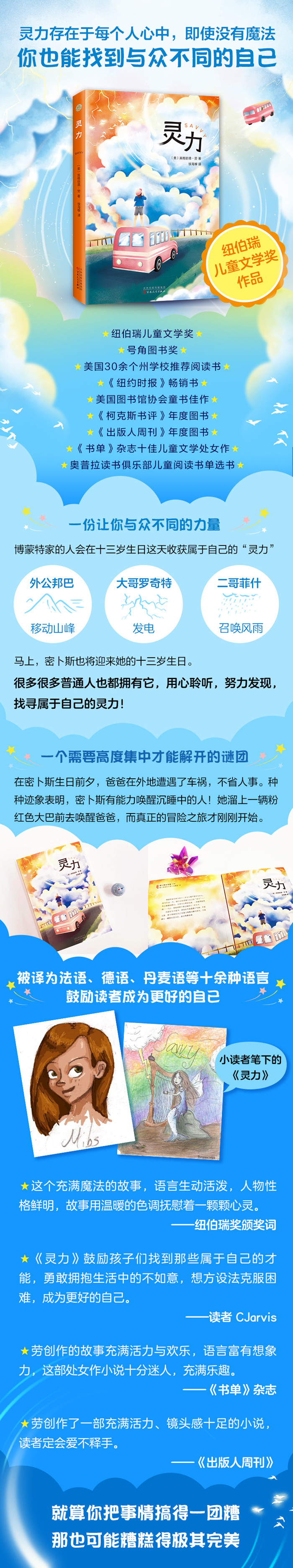 《灵力》以*人称叙事,内容丰富,带领读者跟随主人公密卜斯和她的伙伴们踏上一段乡间冒险之旅,令孩子们逐渐发现自己的价值。这个充满魔法的故事,语言生动活泼,人物性格鲜明,故事用温暖的色调抚慰着一颗颗心灵。——纽伯瑞奖颁奖词 《灵力》向读者介绍了需要面对的挑战、需要认识的朋友,以及需要经历的成长之路。——《柯克斯书评》 劳的语言和笔下的人物与众不同,奇特的构思搭配生动的冒险故事,相信《灵力》一定会赢得广大读者的青睐。——《学校图书馆期刊》