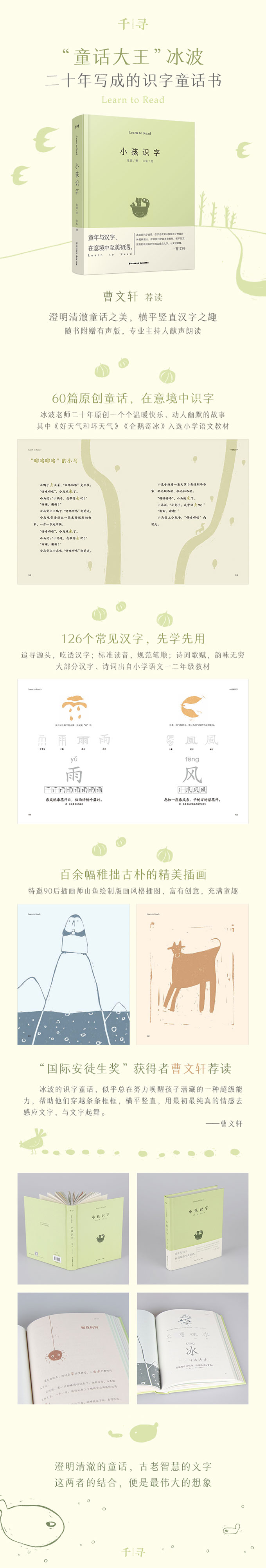 《小孩识字》是一本集趣味性、工具性、人文性于一身的经典读物,以著名儿童文学作家、“童话大王”冰波倾力创作的60篇识字故事为基础,结合5~7岁儿童认知发展规律和心理特点,用字典的形式,认知126个先学先用的汉字,让儿童在一个个动人幽默、快乐温暖的故事里,品味汉字的博大精深。另外,书中由知名插画师原创的稚趣插图,可以带给小读者诗意和美感的双重享受。