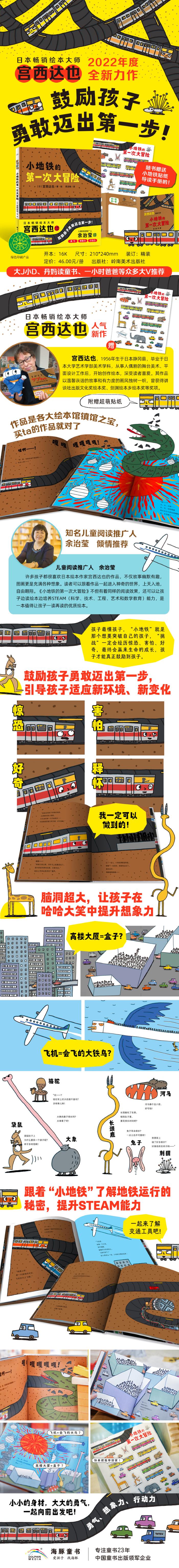 拥有千万“恐龙迷”的日本人气绘本王——宫西达也再创佳作,童趣的交通工具的元素搭配励志主题,鼓励孩子勇敢迈出第一步!帮助孩子适应陌生环境,给予孩子心理安抚和引发情绪共鸣。脑洞大开的想象力搭配诙谐、鲜明的画风让人过目难忘。孩子们更能透过宫西达也笔下小地铁的想象,颠覆我们习以为常的认知,更能激发孩子的思考力、创新力,构建多元能力。 有一辆小地铁第一次投入使用,他感到非常紧张。外面的世界是什么样子呢?会不会遇到故障呢?如果有大蛇怪来偷袭地铁线路,那我可怎么办啊! 他问一辆跑都市线的地铁,外面的世界是怎么样的。这辆地铁告诉他,人们都生活在像盒子一样的楼房里。把人都装在盒子里?那不是很奇怪!小地铁开始了他的想象。有一列专跑机场线路的地铁告诉他,在外面经常可以看到飞机。飞机就像一只钢铁大鸟载着乘客……小地铁凭他的想象,设想出了很多根本不存在的神奇动物。哎呀呀,外面...