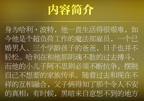 第八个故事。 十九年后…… 身为“大难不死的男孩”,哈利•波特一直生活得很艰难。如今他是一个超负荷工作的魔法部雇员,一个已婚男人,三个学龄孩子的父亲,日子过得并不轻松,与小儿子阿不思之间紧张的父子关 系尤其令他头痛。 最近,魔法部查获了一个新的时间转换器,怪事自此接连不断,先是阿不思和好友一起失踪,接着哈利的伤疤又疼了起来……而这一切似乎都指向那阴魂不散的过去……哈利和他的朋友们再一次陷入危机,他们勇敢地直面挑战,找寻那个隐藏在黑暗之中的真相。