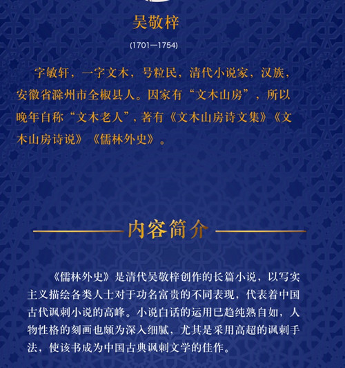 《儒林外史》是清代吴敬梓创作的长篇小说,以写实主义描绘各类人士对于功名富贵的不同表现,代表着中国古代讽刺小说的高峰。小说白话的运用已趋纯熟自如,人物性格的刻画也颇为深入细腻,尤其是采用高超的讽刺手法,使该书成为中国古典讽刺文学的佳作。