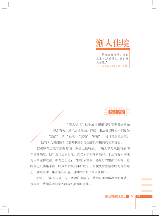 顾恺之吃甘蔗喜欢由根至干、由无味至甘美,所以有了“渐入佳境”;古人夜行看不见路时就扔石头,如果有石头落水的声音就不再前行,于是有了“投石问路”;阮孚清贫,担心钱袋没钱,钱袋难为情,所以钱袋里总留一文钱,于是有了“囊中羞涩”……成语智慧,源远流长。