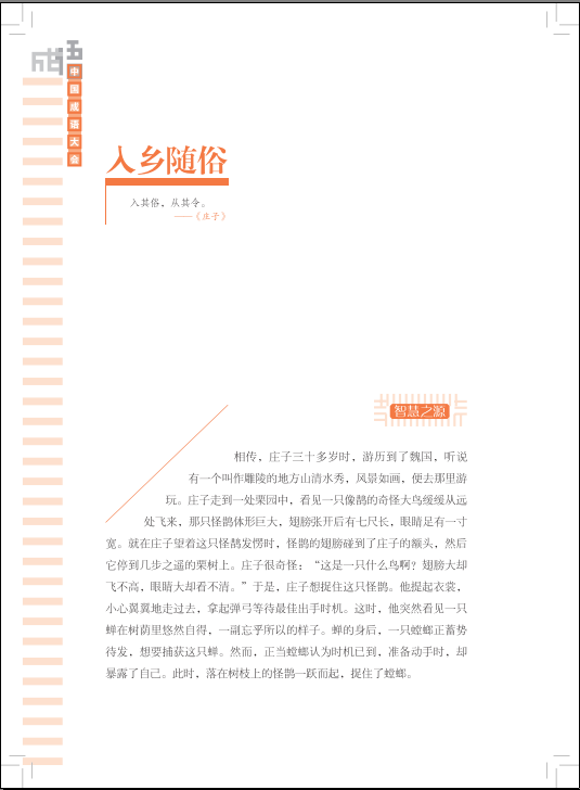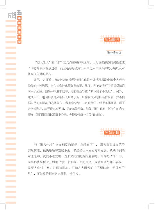 书中每个成语从知识、文化、应用三个角度切入:“智慧之源”考证成语典故、来龙去脉;“智慧解码”由专家独辟蹊径,妙语点评;“智慧语林”,举一反三,诠释近义、反义成语,并作易错提示,构建智慧谱系。