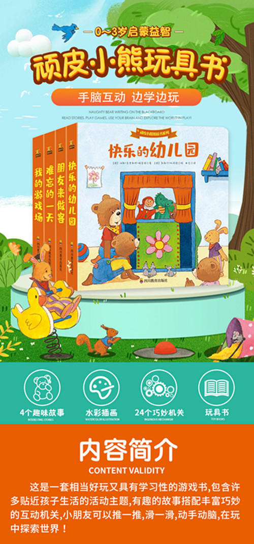 《顽皮小熊纸板书系列》共有4册,分别是《朋友来做客》《难忘的一天》《我的游戏场》《快乐的幼儿园》,通过展现小熊在家里的生活、与伙伴的玩耍、一天的经历和幼儿园的见闻,帮助孩子认识自我、养成好习惯、提高生活能力、健康成长。有趣好玩的故事配上丰富的互动机关,小朋友可以推一推、拉一拉和转动机关,运动自己的小肌肉,促进手指灵活与发展,是相当好玩又具有学习性的幼儿童书。