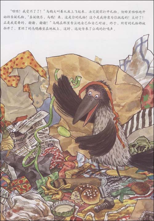 乌鸦低垂着头对他的好朋友说道:“昨天晚上我怎么也睡不着,就干脆起来把所有的礼物都给打开了!所以今年的圣诞节我没有礼物可收了。”