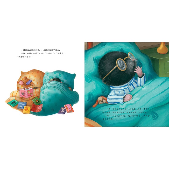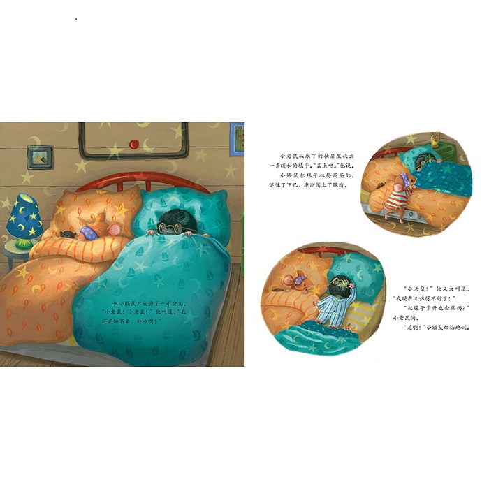 夜已经深了,小鼹鼠还没睡着,他实在是太难入眠,于是他去找自己的好朋友小老鼠。小老鼠给小鼹鼠想了许多办法——一起看睡前故事书;害怕的话就剪一个美丽的夜灯;冷的话就盖上温暖的毯子;既然热了就把床移到窗边……折腾了好久好久,小鼹鼠睡着了吗?也许,好朋友陪伴在身边,才是安心入眠的绝妙办法!