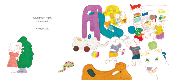 老师,不要叫我!小朋友们,不要靠近我!让我一个人玩吧。因为我是个很害羞的孩子。虽然我也很想跟大家一起捉迷藏。“快,快藏起来!”“哈,我看见你了!”虽然很害羞,但是我鼓起勇气“快快藏起来!”再大点声!勇敢地向外迈一步,慢慢地,慢慢地。