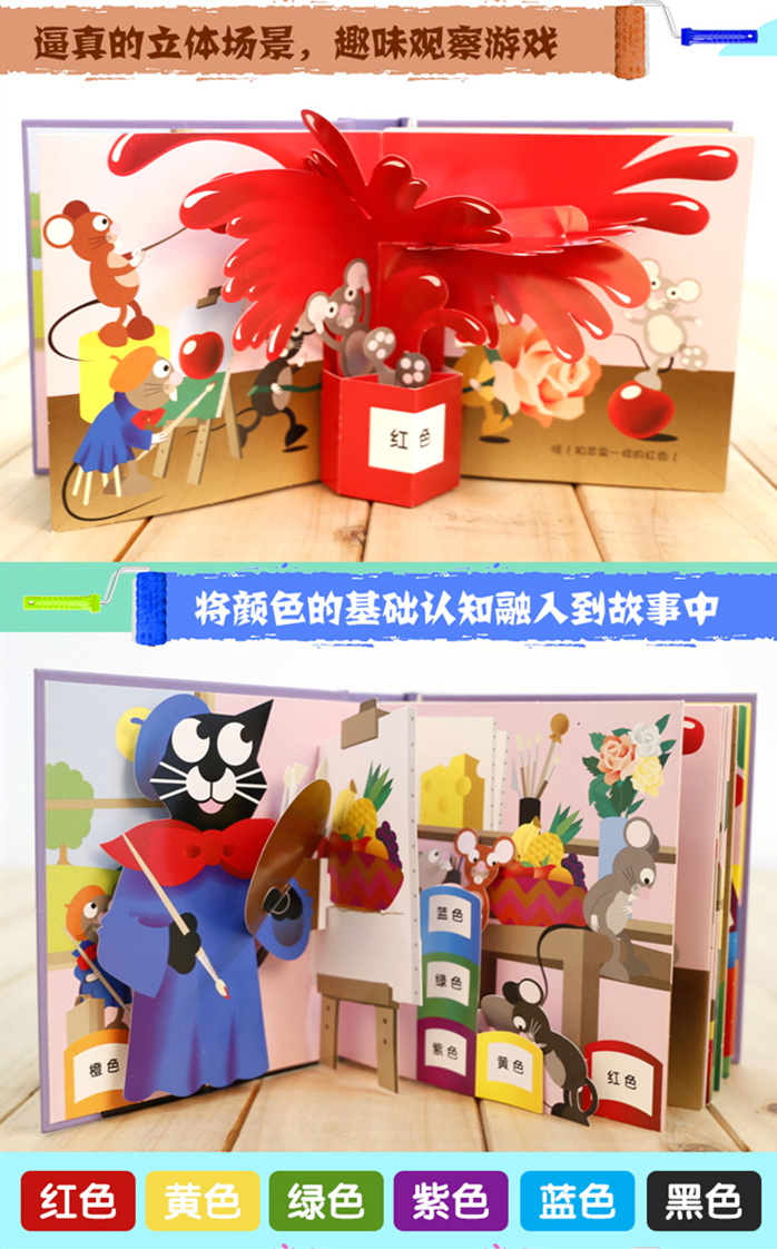 和喵喵、吱吱一起来画画喽,感受不同颜色从书中迸出的惊喜!真不亏为立体书大师——戴维·佩勒姆的经典作品。当宝宝们打开书,各种缤纷的色彩立即跳到眼前,就好像是谁泼出来的一样,有一种特别强的视觉震撼力,保证让我们的宝宝们大吃一惊。在这种惊喜感觉的影响下,宝宝*容易记住事物了。再看看我们调皮的主角们——喵喵和吱吱,哇,它们正在学画画呢!可是你看看,调皮的吱吱居然把颜料打翻了,弄的到处都是。这种欢乐的故事场景,有很强的代入感,宝宝们翻开书,活动的立体互动方式,让他们也参与其中,享受阅读带来的快乐。绚丽的色彩,刺激对颜色认知的同时也有助于智力开启,加上可爱的动物形象,贴合宝宝们的需要,给他们*轻松有趣的阅读体验,提升对书本的兴趣。