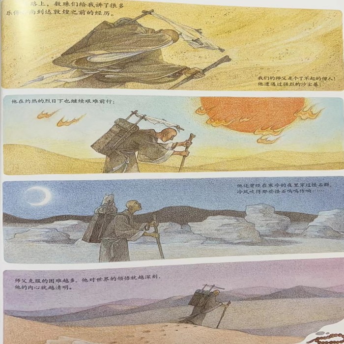 这个绘本自小女孩无意间捡到的一枚石头开始:老石头长了一副“老人脸”,像一位老神仙似的被小女孩自沉眠的旧梦中唤醒,将纵穿数千年的敦煌历史画卷徐徐展开: