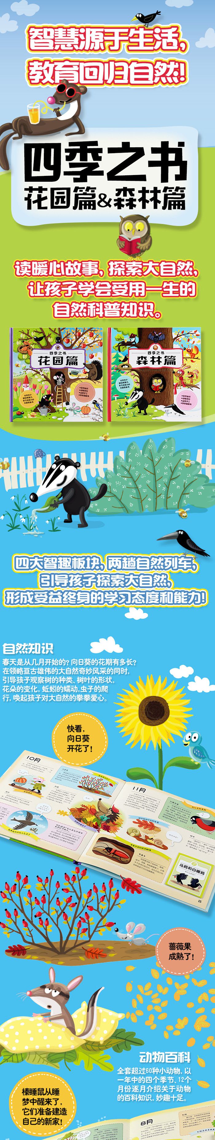 这是一本通过精美的画面、精巧的制作设计,让孩子在图画和知识中了解花园、各种动植物知识的精美翻翻书。适合3-5岁的儿童阅读。书中通过一年四季,春夏秋冬的变化,展示了从1-12月中森花园的动物、植物的习性和生活习惯。画风呆萌可爱,充满幽默感,大量的翻翻页,翻开后能获取更多的相关知识,能使小朋友更加深刻形象的理解花园中自然知识。除此之外还有小实验、动手能力等环节,让小朋友认识自然、了解自然。