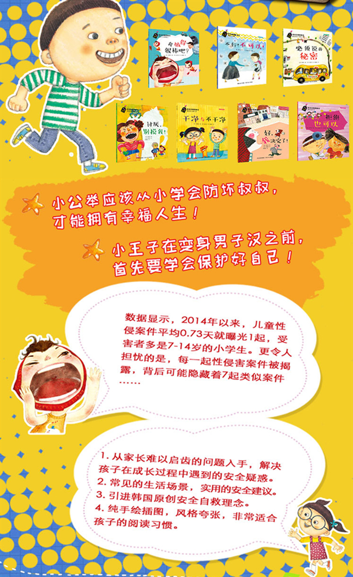 适读人群 :3-6岁 1、引进韩国原创安全自救理念。 2、以纯手绘插图,为孩子普及安全自救基本知识。 3、绘图风格夸张,非常适合孩子的阅读习惯。 4、从家长难以启齿的问题入手,帮助家长解决孩子在成长过程中遇到的关于性与安全的疑惑,有助于孩子生理与心理健康成长。