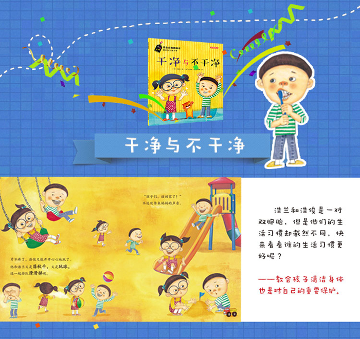 《干净与不干净》:我会自己洗干净 浩兰和浩俊是一对双胞胎,但是他们的生活习惯却截然不同,看,他们连刷牙的样子都不一样呢,你觉得谁的生活习惯更好呢?
