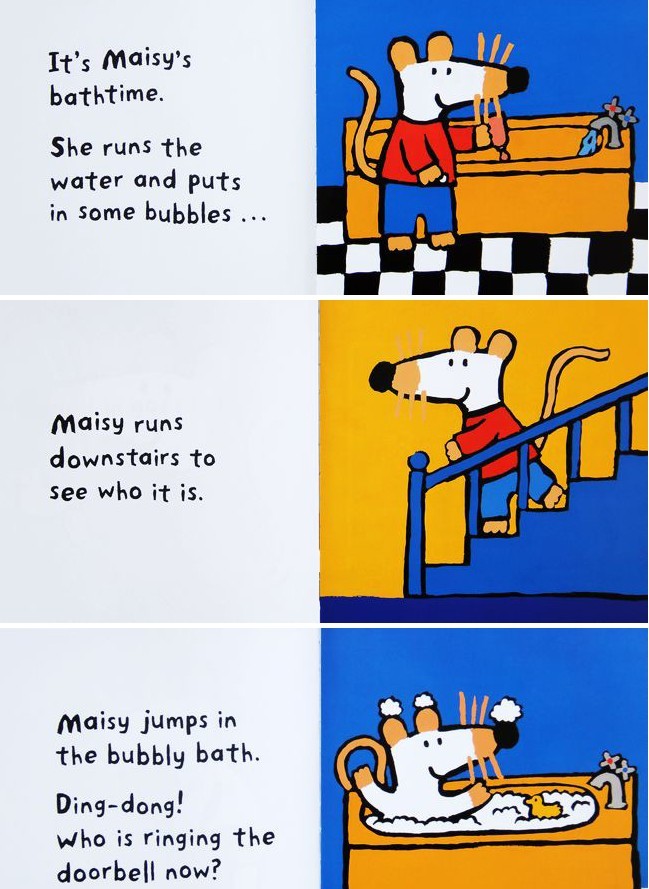 这系列简单绘本皆以生活起居为主轴背景,和小朋友的日常生活习习相关,简单明了,重点是Maisy的绘本一向色泽分明,对于年幼的孩子来说,是非常适合学习认知的一个系列绘本;采图文分开的编排,爸爸妈妈可以先让小朋友看着图片,加上自己丰富的想像,先编织一个属于自己的小故事;再跟着Maisy的脚步,学习文字句型的解析,都是非常有趣的阅读方式哦!