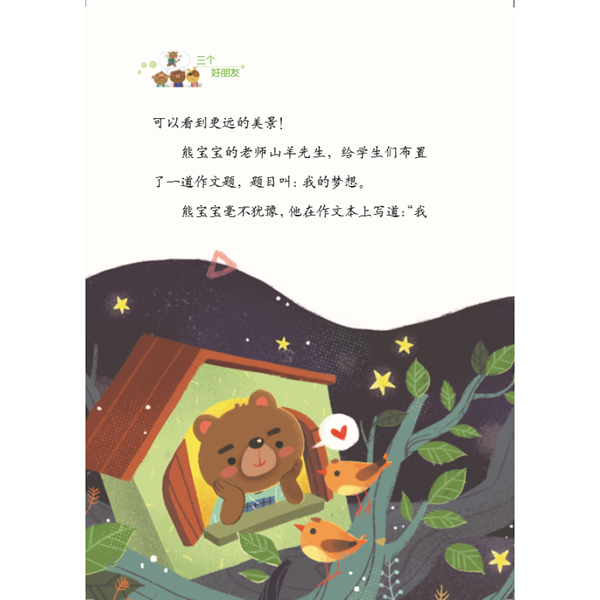 森林里的熊宝宝、汪汪狗和*噜噜,是特别好的朋友。他们猜测一厘米之外有什么;他们想像鸟儿一样住到高高的树房子里去;他们为给熊妈妈准备新奇的生日礼物忙来忙去;他们为谁di yi个发现了树洞吵来吵去……作者以幽默的语言、童真的想象,诗意地描绘三个小伙伴之间有趣的争吵、可笑的竞争、一起经历的美好的日子。游戏式的生活,洋溢着浓浓的幸福与快乐;在小小的失败和困惑中,他们渐渐懂得了每个朋友都有不一样的地方,所以,每个人都要学会理解和包容:世界在他们的眼中和心里在一点点变大。