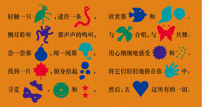 振翅而飞的昆虫、扭动的蠕虫、飞溅的雨水、闪耀的星星——除了儿童,没人会注意到周围世界中的这些细节。美国著名的图画书作家洛伊丝 埃特,以一种充满活力的展现方式,将孩子眼中的大自然中完美呈现了出来。该书通过一个个简单的猜谜游戏,将读者对大自然的热爱之情充分激发出来,帮助他们以一种全新的角度来看这个世界。