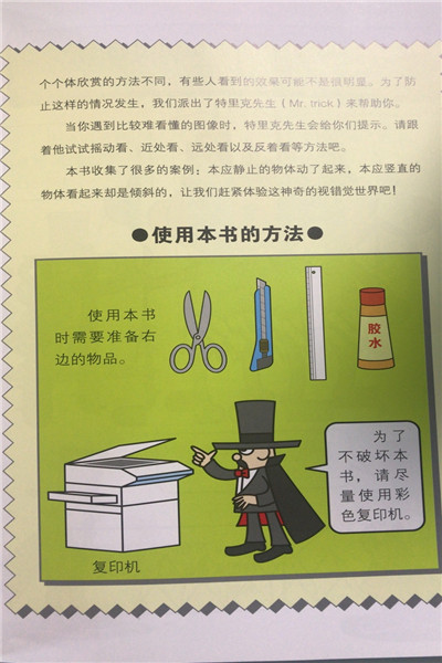 这是一套适合5岁以上所有人阅读的科学益智游戏类图书。它是以由于客观因素或心理因素干扰下产生的“视觉错觉”为游戏对象,分类为:长度、颜色、运动、发光、隐藏和寻找等六个主题来讲述。 1.这是一套趣味性、知识性极强的图书,主旨鲜明有特色,是市面上少见的科学益智游戏书。每个关于视错觉的主提下囊括了多个经典、新奇的鲜活例证,图片清晰多彩生动且附带小提示,尤其是对于不了解错视觉的读者来说,即便是在同一个主题下每页的内容都没有感到乏味。 2.这套书从生活中选取有趣、令人吃惊的例证,如马路上的人行横道、家里铺的地板砖等,从而引起读者的关注和思考,进而在生活中培养更为积极的观察能力和发现能力。且每一个视错觉现象都已被命名,有一定的科学依据及来源,所以也大大提高了它的可读性。 3.通过一个个生动有趣的实例,也映射出产生视错觉并不是单一因为眼睛产生的误差造成的,而是我们的大脑对看到的事物进行分析的过程中反射出的错觉。视错觉与心理学、生理学、生物学也息息相关,这对于提高小读者探究科学知识也具有一定的作用,因为小读者可以在趣味中产生好奇从而认知世界的奇妙性。 4.本书的另外一个显著的优点就是,适读者的年龄范围比较宽泛,从小学到成年人都可以阅读,少量及简单文字有助于低龄儿童的阅读,而其趣味性又可吸引其他年龄层读者的阅读兴趣。同时,还增加了一些动手去做的内容,这样小读者也可更直观地了解视错觉的奇妙性。
