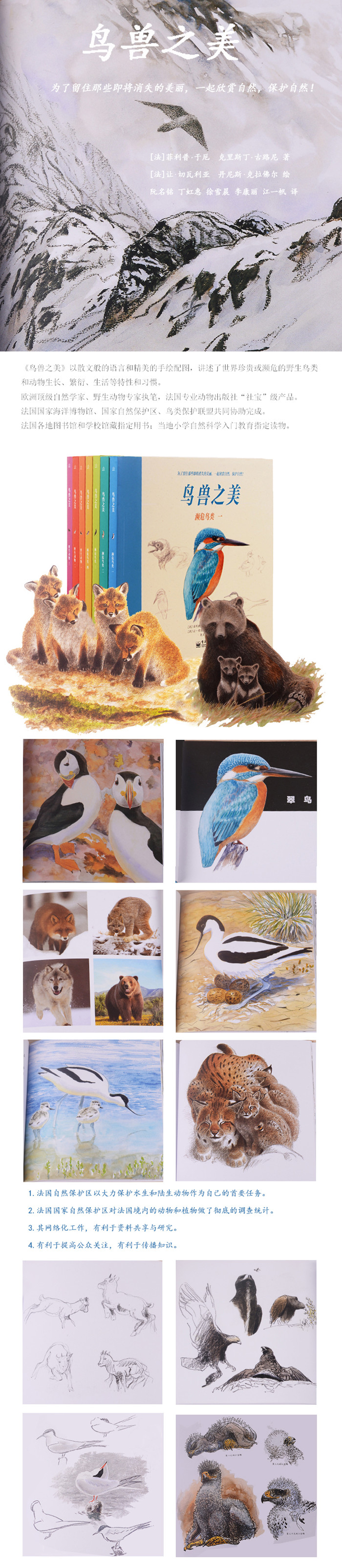 由法国专业动物出版社发起,国家自然保护区、鸟类保护联盟共同协助完成的看家系列《鸟兽之美》,召集了欧洲的自然学家、野生动物研究专家执笔,并由专门从事动物绘画的画家制作插画,将艺术与科学完美融合在一起,来讲述世界濒危/珍贵动物的现状。