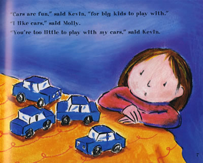 This fine offering introduces the concept of patterns. Kevin has red, yellow, and blue cars that he always lines up in a special way on his shelf. His little sister Molly wants to play, but is told she is too young.