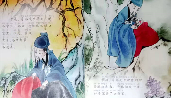 狼装作软弱可怜的样子,迷惑了糊涂、迂腐的东郭先生,求得他的庇护。等到危险一过,狼又立刻露出凶狠吃人的本性。幸好一位机智的农夫及时搭救,东郭先生才幸免于难。