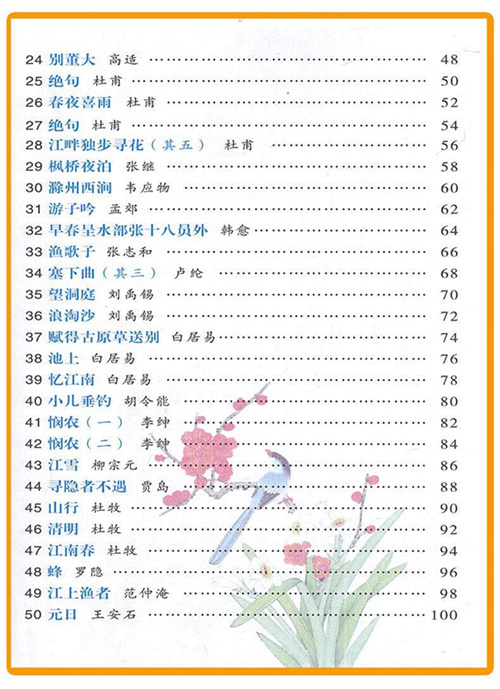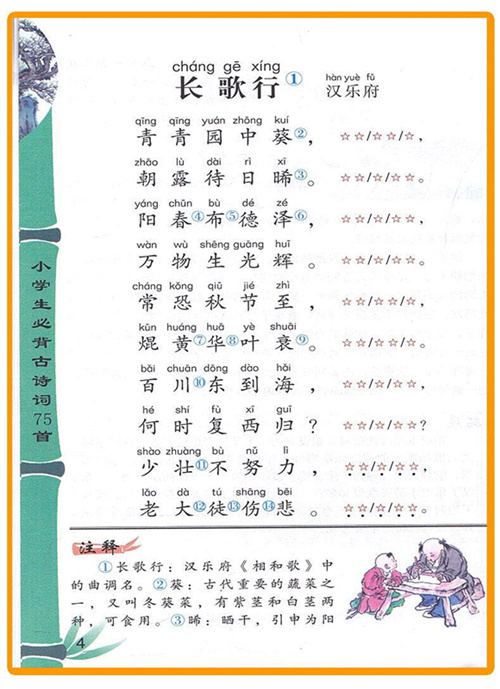 本书根据教育部最新颁布的《义务教育语文课程标准》所推荐的小学部分必背古诗词篇目而编写,共选入古诗词75首。书中所编选的75首古诗词,时间跨度较长,最早的距今已有两千多年,最晚的也有一百六十多年。这些古诗词都是篇幅短小、文辞优美、内容健康易懂、读来朗朗上口的艺术珍品,很适合小学生阅读。