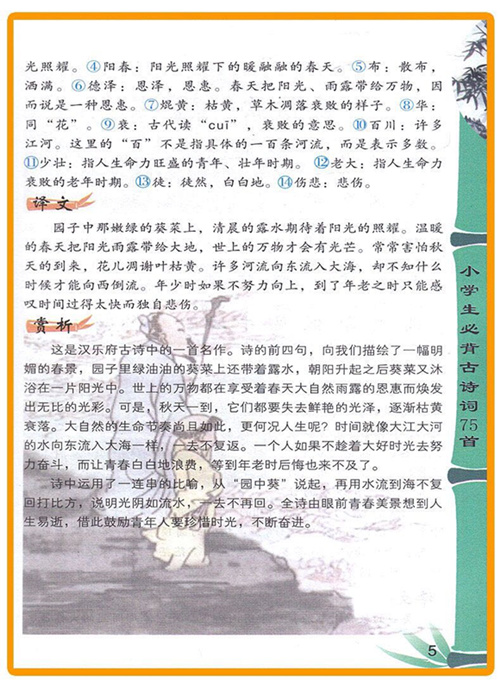 这是一首咏叹人生的歌。园子里青葵上的露珠,等太阳出来就会被晒干;温暖的春天让万物都生机勃勃,但是到了秋天就会衰败、凋零;千万条江河向东流向大海,什么时候才能流回来呀?人生又何尝不是这样?一个人如果不趁着青春年少的大好时光努力学习,到年老力衰的时候再后悔也来不及了。全诗借物喻理,出言警策,催人奋进。“少壮不努力,老大徒伤悲”已成为流传千古的名句。