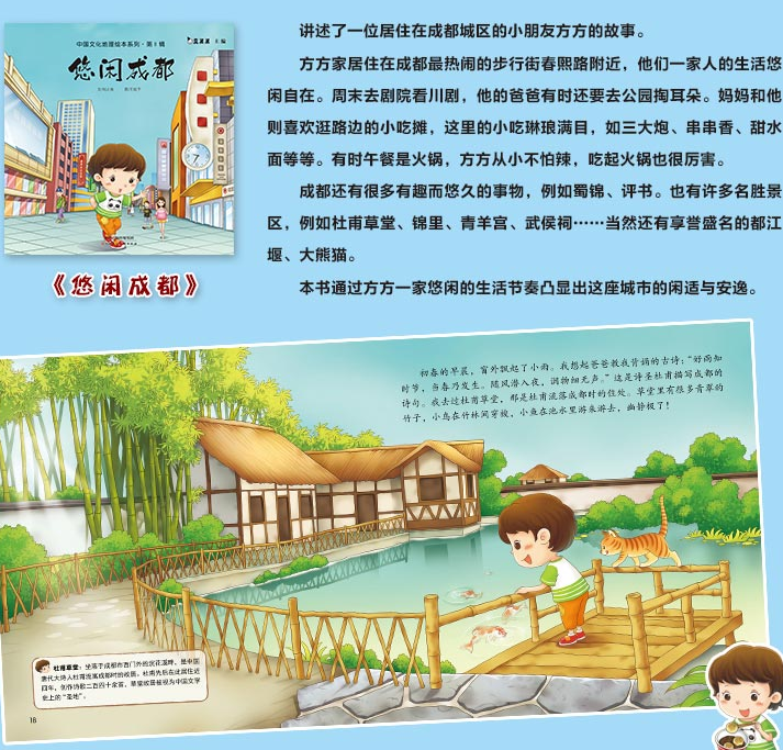 《悠闲成都》讲述了一位居住在成都城区的小朋友方方的故事。