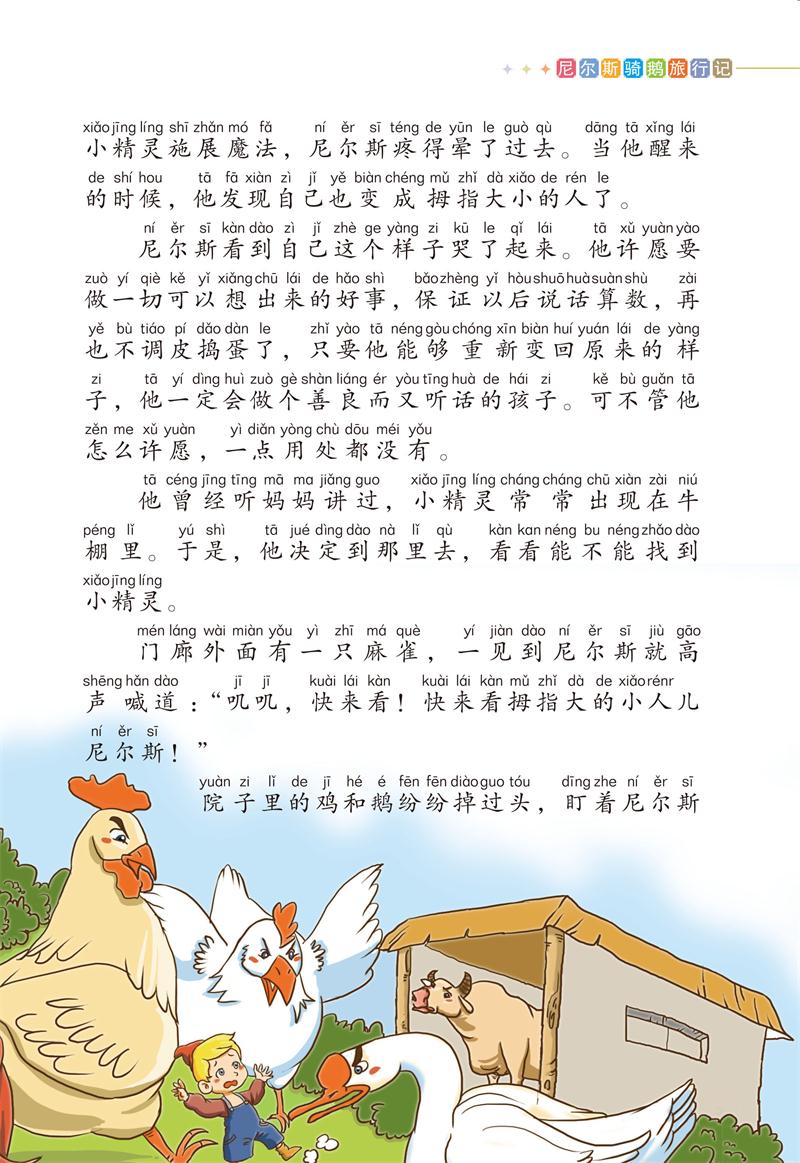 故事讲述了一个不爱学习,喜爱恶作剧的顽皮小男孩尼尔斯的历险经历,尼尔斯被小精灵施法变成了一个拇指大小的小人儿,骑在鹅背上走南闯北,周游各地。在这次长途旅行中,尼尔斯看到了祖国的美丽风光,结识了许多朋友,增长了见识,经历了种种困难与危险,逐渐改正了自己以前的缺点,成为一个勇敢善良、助人为乐的大男孩。
