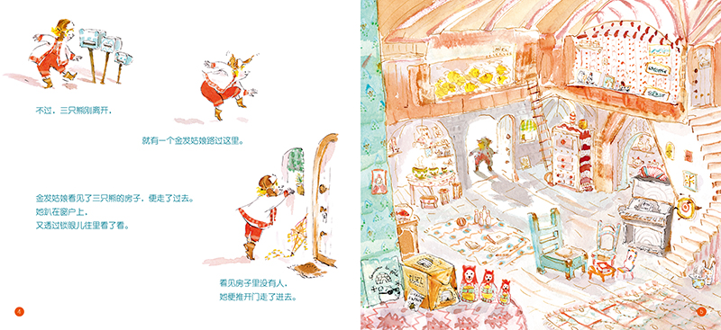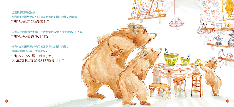 森林里的一座房子里面住了三只可爱的熊,一只特别大,一只特别小,一只中等大小。有一天,三只熊离开家门去散步,一个金发的小姑娘闯了进来,她做了一系列的举动,而且当三只熊回来的时候,小姑娘依旧躺在床上睡觉呢。结果会如何呢?