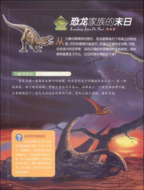 在 人类统治世界之前,地球上还出现过一批强大的主宰者,它们曾经统治世界长达1.6亿年,这就是本书的主角——恐龙。所谓恐龙,简单地说,就是指中生代时期 地球上的爬行类动物,而空中的翼龙和水里的海龙都不是恐龙,不得不说,恐龙是一种非常神秘的动物。在三叠纪晚期,它们横空出世,并轻而易举地占据了地球统 治者的位置。经过漫长的侏罗纪,到了白垩纪,恐龙迎来了全盛时期。而正当它们的家族日益庞大的时候,恐龙却在白垩纪晚期突然灭绝。