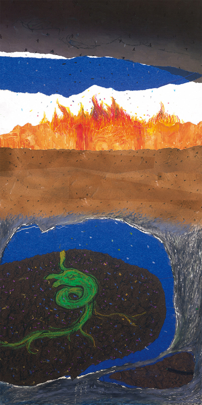 质地的变化来传达信息与情感,黄色的亮点、绿色的种子、蓝色的水流、红色的烟火和棕色