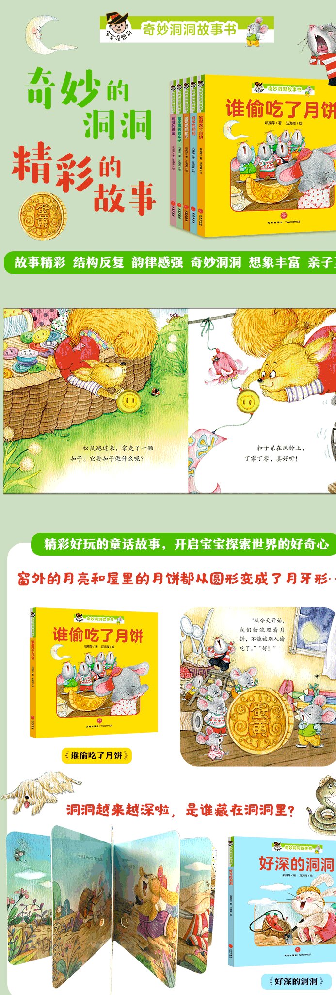 本丛书根据中国宝宝的认知规律创作,是一套原创婴儿图画书。书中的故事情节和生活细节相结合,可以帮助宝宝提升观察力、联想力、想象力。本套书语言优美,每一本的内容都既是有趣的童话,也是动听的童诗,特别适合启迪宝宝的语言能力。本套书中每一幅精美的图画中其实都蕴藏着丰富的认知点和有趣的互动游戏,适合亲子共读,有助于建立和谐的亲子关系。《老奶奶的扣子》讲述了几个小动物借用老奶奶的扣子去做自己喜欢的小物件的故事。每个小动物都用独特的创意赋予原本不起眼的小扣子非凡的魅力,使它发挥出神奇的力量。