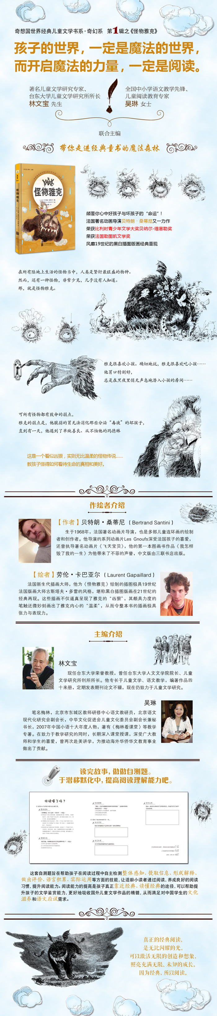 这套奇幻系经典儿童文学作品全部内附全国著名中小学语文教学专家精心打造的“阅读能力评价单”(《你读懂了吗?》), 旨在帮助孩子在阅读过程中自主检测整体感知、提取信息、形成解释、做出评价、语言积累、实际运用等方面的技能,让适龄小读者通过阅读,养成良好的阅读习惯,提升阅读能力。而阅读能力的提高是孩子真正靠近经典、读懂经典的途经,它可以帮助提升孩子的文学鉴赏能力,更好地吸收国外儿童文学作品的精髓,从而满足对中国学生的文化滋养和语文应试需求。