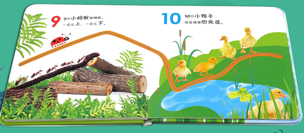 快来,沿着瓢虫的脚印开始一场数字旅行吧,用小手摸着凹槽小路和凸起来的图片,大声朗读,从1数到10,看看你一路都会遇到哪些可爱的小动物吧……