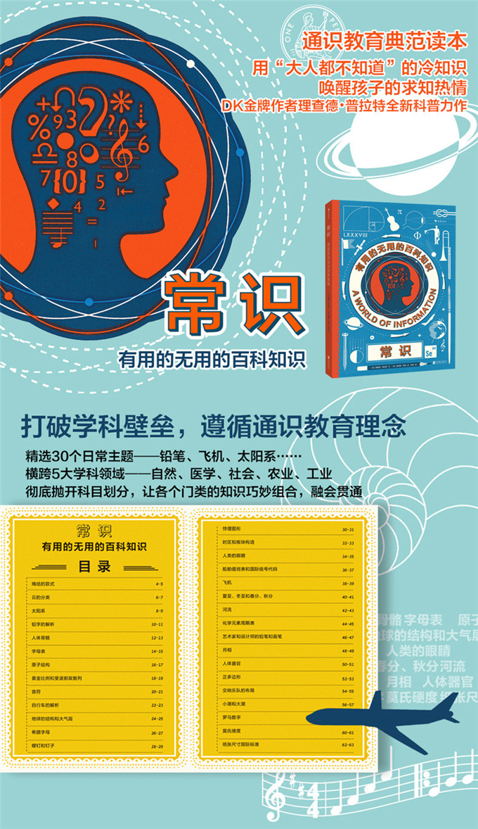 建议分类:百科类。《常识》全书64页,涵盖30个学科的框架知识。具体是以每两页一个学科主题的极简模式,向大家迅速展示我们五彩缤纷的世界。从传统的绳结到管弦乐队,从气象云朵到潮汐节气,从山川河流到几何结构,从宇宙天文到原子结构,从身体结构到机械原理,从远古文字到信号代码,等等。无论是懵懂的小孩,还是忙碌的大人,这本书都会立刻向你敞开世界的大门,并让你获得极大的视野,知晓这世界的每一个领域。64页30个领域,让你迅速联通全世界!