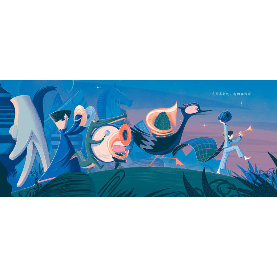 在罗伯特·亨特的插画中,“睡梦之乡”的主色调是沉静冷峻的蓝色,而照亮这个世界的,是一种奇异的粉红光芒。值得一提的是,这本书不是用常规的四色印刷,而是用四种专色印刷的,这使得画面更有冲击力,增强了“睡梦之乡”的神秘感。