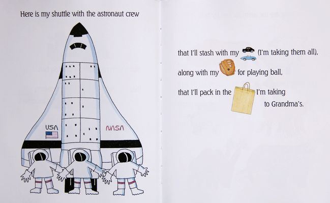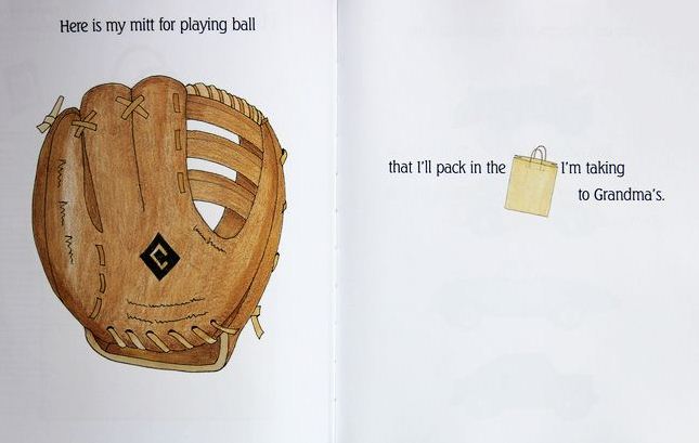 "A familiar story of differing viewpoints between mother andchild is presented in charmingly simple cumulative verse andrebuses. A young boy is packing for a trip to visit hisgrandmother. He fills a shopping bag with his mitt, cars, spaceship, wooden animals, his favorite stuffed rabbit, his pillow, abook a flashlight. But then along comes mom with ideas of herown!....This is a real winner....Great fun."--School LibraryJournal.