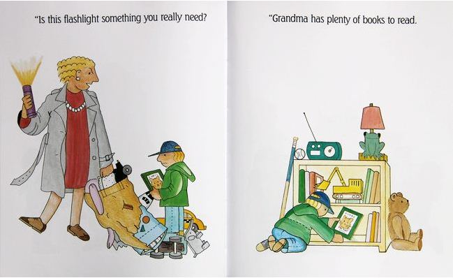 小男孩要到外婆家玩,他把所有的玩具、故事书全都打包了,可是真的需要准备那么多的东西吗?